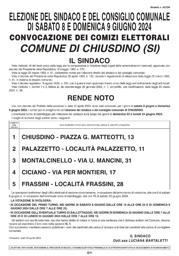Elezioni del Sindaco e del Consiglio Comunale di sabato 8 E domenica 9 giugno 2024 ed Elezioni dei Membri del Parlamento Europeo spettanti all'Italia di sabato 8 e domenica 9 giugno 2024 - Convocazione dei Comizi Elettorali
